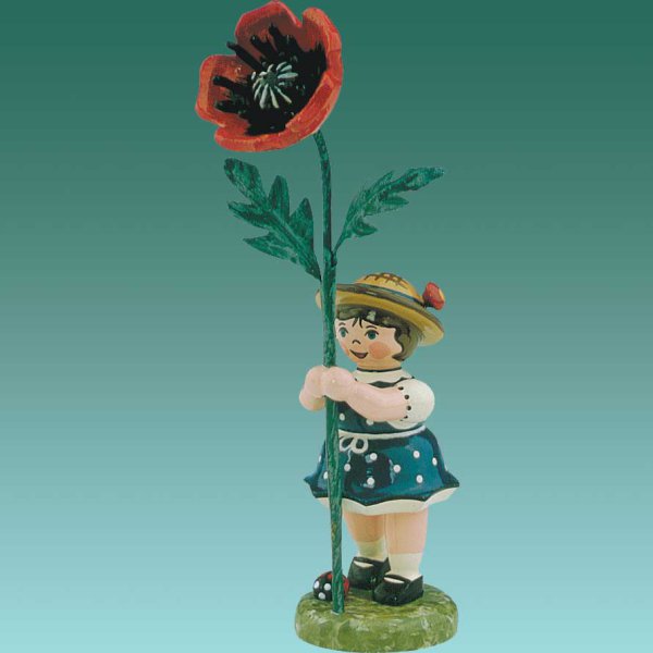 - Sehr schönes Blumenkind, gefertigt in Handarbeit.- Motiv: Blumenmädchen "Mohnblume", blaues Kleid- handbemaltes Holz- Höhe: 11cm